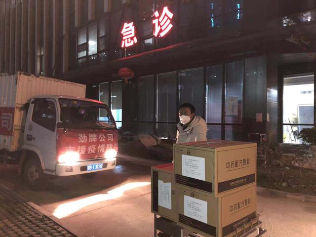 1月28日中午,一辆载有新型肺炎预防药品的货车从劲牌公司出发,第二次驰援武汉疫区。到达武汉高速路出口,货车司机何师傅与劲牌武汉总经销杨仕祥派来的三辆车接上头,接力将4.4万副药品分头在第一时间送往武汉十余家医院。头一天,何师傅一辆车送武汉7家医院,送到凌晨1点才返回黄石。