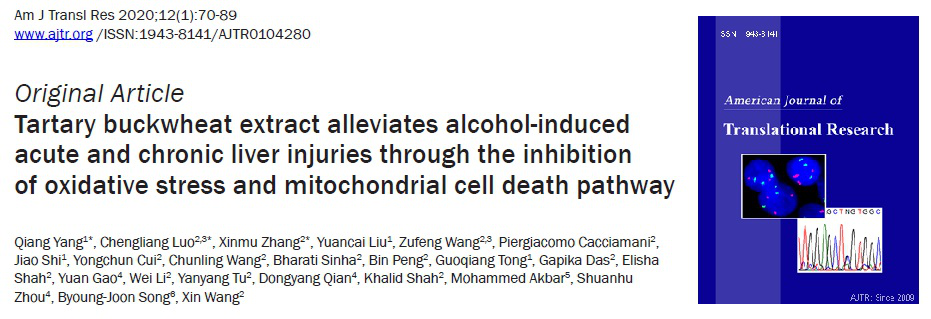 本研究首次依托国外科研机构美国哈佛大学医学院布里根妇女医院,采用酒精性肝损伤动物模型与肝细胞模型,开展毛铺苦荞酒低、中、高三个剂量组对酒精引起的急性、慢性肝损伤影响研究。研究证明毛铺苦荞酒对酒精引起的急性和慢性肝损伤有保护作用;且以毛铺苦荞酒中、高剂量效果最佳,其功效与阳性对照姜黄素相近,具有辅助减小酒精性肝损伤的作用。该研究为毛铺苦荞酒的健康开发理念和饮酒过程中减少酒精性肝损伤研究打下坚实的基础。